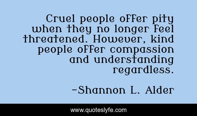 This page presents the quote "Cruel people offer pity when they no longer feel threatened. However, kind people offer compassion and understanding regardless.". Author of this quote is Shannon L. Alder. This quote is about communication, competition, reaching-out, talking, fake, anger, passive-agressive-behavior, hurting-people, mental-disorders,.