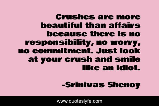 This page presents the quote "Crushes are more beautiful than affairs because there is no responsibility, no worry, no commitment. Just look at your crush and smile like an idiot.". Author of this quote is Srinivas Shenoy. This quote is about love, madness, affection,.