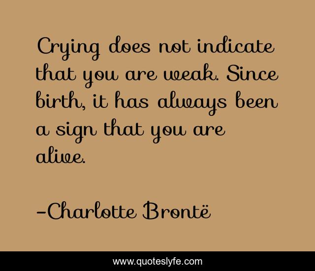 This page presents the quote "Crying does not indicate that you are weak. Since birth, it has always been a sign that you are alive.". Author of this quote is Charlotte Brontë. This quote is about life, inspiration, emotions, wisdom,.