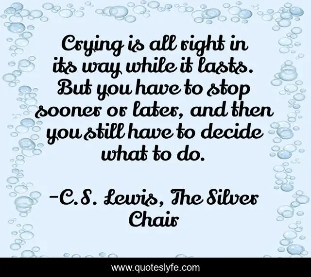 This page presents the quote "Crying is all right in its way while it lasts. But you have to stop sooner or later, and then you still have to decide what to do.". Author of this quote is C.S. Lewis, The Silver Chair. This quote is about books, decisions, cry, crying,.
