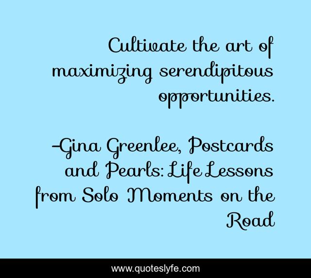 "Gina Greenlee, Postcards and Pearls: Life Lessons from Solo Moments on the Road Quotes." Quoteslyfe.com, 2025. Sat. 06 Dec. 2025. <https://www.quoteslyfe.com/quote/Cultivate-the-art-of-maximizing-serendipitous-opportunities-109473>.