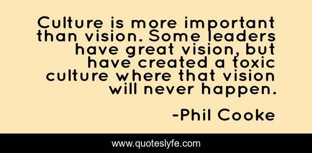 This page presents the quote "Culture is more important than vision. Some leaders have great vision, but have created a toxic culture where that vision will never happen.". Author of this quote is Phil Cooke. This quote is about environment, culture, optimism,.