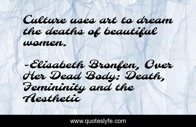 "Elisabeth Bronfen, Over Her Dead Body: Death, Femininity and the Aesthetic Quotes." Quoteslyfe.com, 2025. Sat. 06 Dec. 2025. <https://www.quoteslyfe.com/quote/Culture-uses-art-to-dream-the-deaths-161254>.
