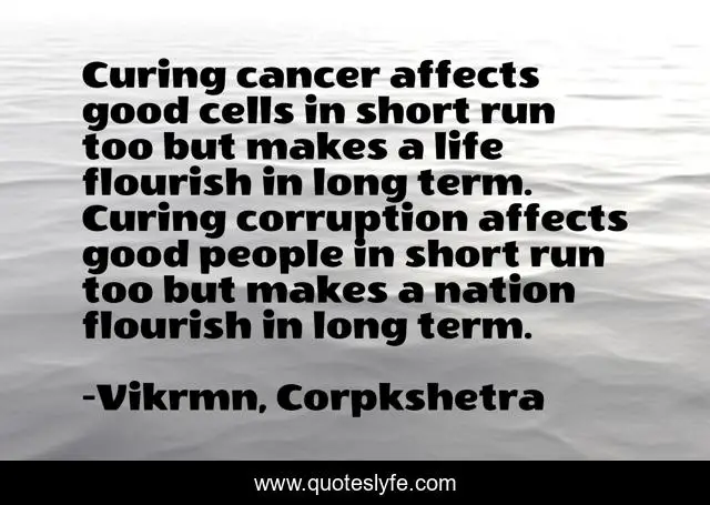 This page presents the quote "Curing cancer affects good cells in short run too but makes a life flourish in long term. Curing corruption affects good people in short run too but makes a nation flourish in long term.". Author of this quote is Vikrmn, Corpkshetra. This quote is about corpkshetra, confidence, vikram, inspirational, cancer, positive, motivational, ca-vikram-verma, chartered-accountant,.