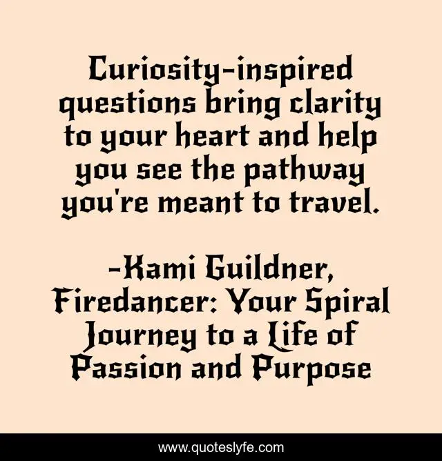 "Kami Guildner, Firedancer: Your Spiral Journey to a Life of Passion and Purpose Quotes." Quoteslyfe.com, 2025. Fri. 05 Dec. 2025. <https://www.quoteslyfe.com/quote/Curiosity-inspired-questions-bring-clarity-to-your-81020>.
