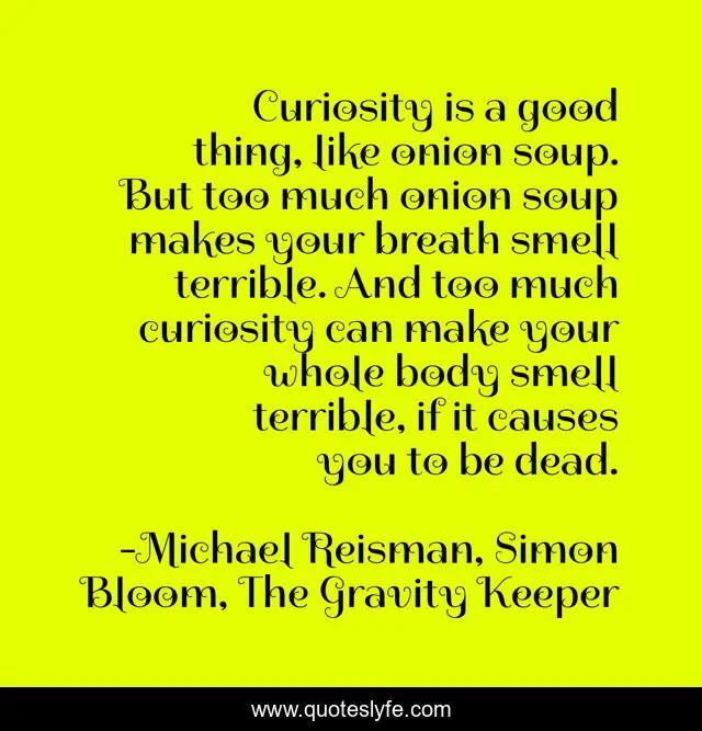 This page presents the quote "Curiosity is a good thing, like onion soup. But too much onion soup makes your breath smell terrible. And too much curiosity can make your whole body smell terrible, if it causes you to be dead.". Author of this quote is Michael Reisman, Simon Bloom, The Gravity Keeper. This quote is about soup, death, curiosity,.