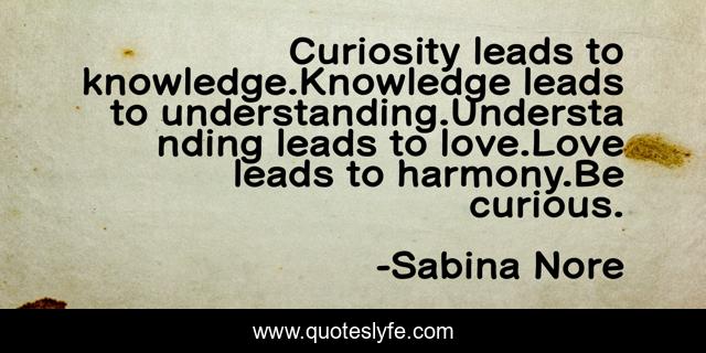 This page presents the quote "Curiosity leads to knowledge.Knowledge leads to understanding.Understanding leads to love.Love leads to harmony.Be curious.". Author of this quote is Sabina Nore. This quote is about love, knowledge, understanding, harmony, curiosity, curious, affection,.
