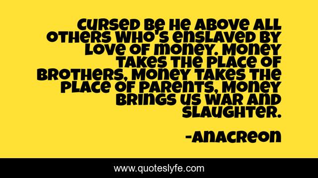 This page presents the quote "Cursed be he above all others Who's enslaved by love of money. Money takes the place of brothers, Money takes the place of parents, Money brings us war and slaughter.". Author of this quote is Anacreon. This quote is about money, love, affection, parents,.