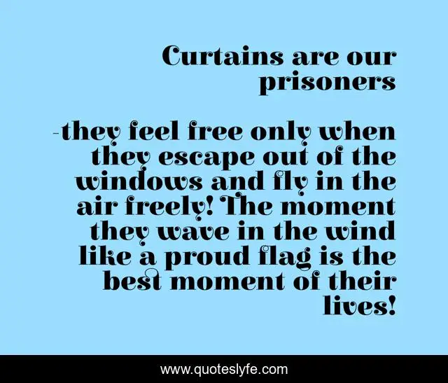 This page presents the quote "Curtains are our prisoners". Author of this quote is they feel free only when they escape out of the windows and fly in the air freely! The moment they wave in the wind like a proud flag is the best moment of their lives!. .