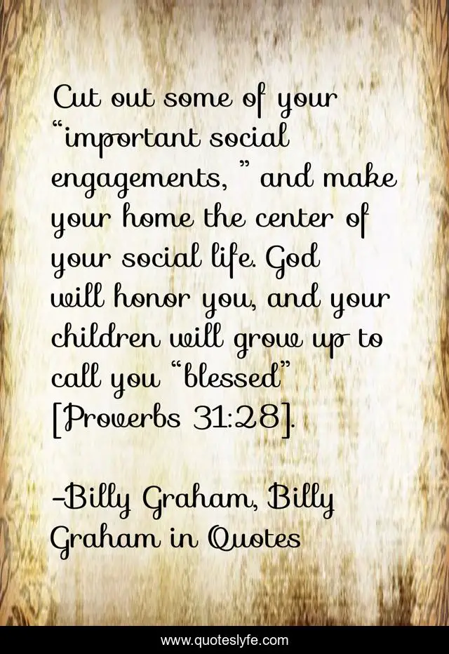 This page presents the quote "Cut out some of your “important social engagements, ” and make your home the center of your social life. God will honor you, and your children will grow up to call you “blessed” [Proverbs 31:28].". Author of this quote is Billy Graham, Billy Graham in Quotes. This quote is about home, billy-graham,.