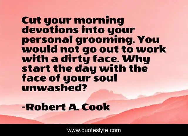 This page presents the quote "Cut your morning devotions into your personal grooming. You would not go out to work with a dirty face. Why start the day with the face of your soul unwashed?". Author of this quote is Robert A. Cook. This quote is about work, day, soul,.
