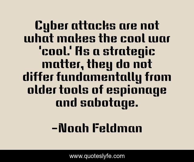 This page presents the quote "Cyber attacks are not what makes the cool war 'cool.' As a strategic matter, they do not differ fundamentally from older tools of espionage and sabotage.". Author of this quote is Noah Feldman. This quote is about matter, tools, war,.