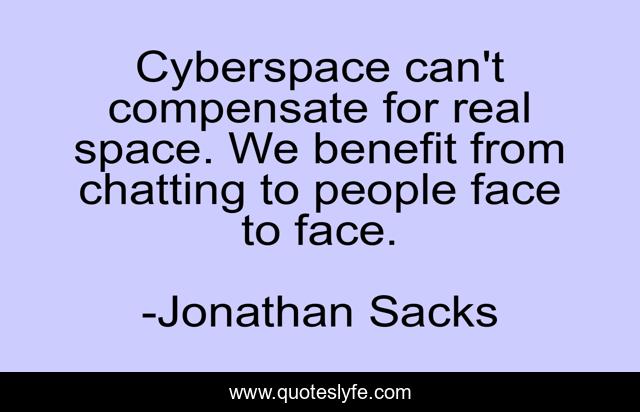 This page presents the quote "Cyberspace can't compensate for real space. We benefit from chatting to people face to face.". Author of this quote is Jonathan Sacks. This quote is about people, technology, face,.