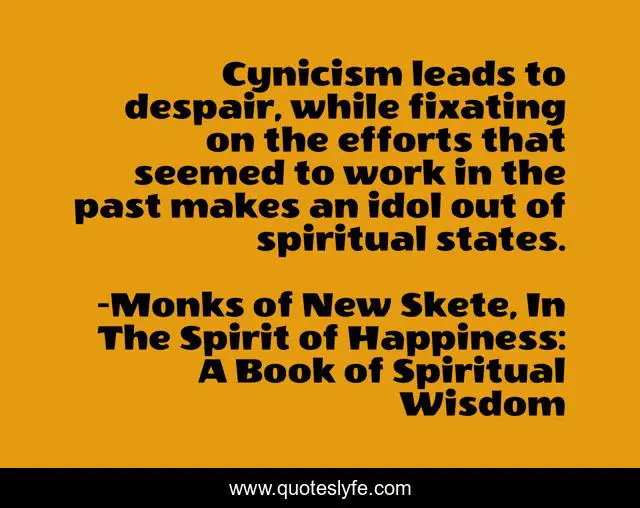 This page presents the quote "Cynicism leads to despair, while fixating on the efforts that seemed to work in the past makes an idol out of spiritual states.". Author of this quote is Monks of New Skete, In The Spirit of Happiness: A Book of Spiritual Wisdom. This quote is about spirituality, happiness,.