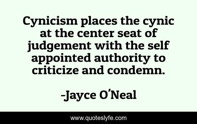 This page presents the quote "Cynicism places the cynic at the center seat of judgement with the self appointed authority to criticize and condemn.". Author of this quote is Jayce O'Neal. This quote is about love, god, dr-jayce, jayce-oneal, cynicism, affection,.