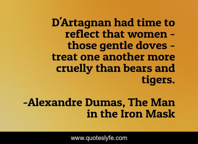 This page presents the quote "D'Artagnan had time to reflect that women - those gentle doves - treat one another more cruelly than bears and tigers.". Author of this quote is Alexandre Dumas, The Man in the Iron Mask. This quote is about scorn, jealousy, cruelty, women,.