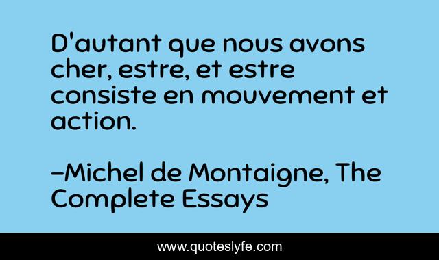 This page presents the quote "D'autant que nous avons cher, estre, et estre consiste en mouvement et action.". Author of this quote is Michel de Montaigne, The Complete Essays. This quote is about essay, renaissance, skepticism, philosophy, french,.