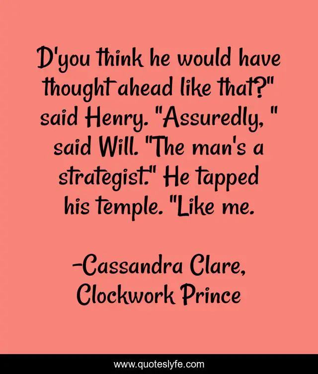 This page presents the quote "D'you think he would have thought ahead like that?" said Henry. "Assuredly, " said Will. "The man's a strategist." He tapped his temple. "Like me.". Author of this quote is Cassandra Clare, Clockwork Prince. This quote is about humour, henry,.