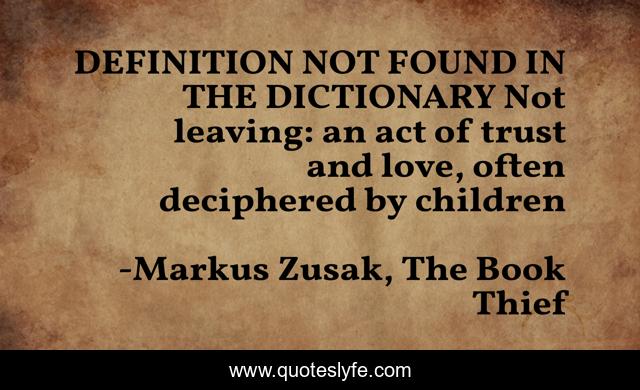 This page presents the quote "DEFINITION NOT FOUND IN THE DICTIONARY Not leaving: an act of trust and love, often deciphered by children". Author of this quote is Markus Zusak, The Book Thief. This quote is about security, trust, safety, childhood,.