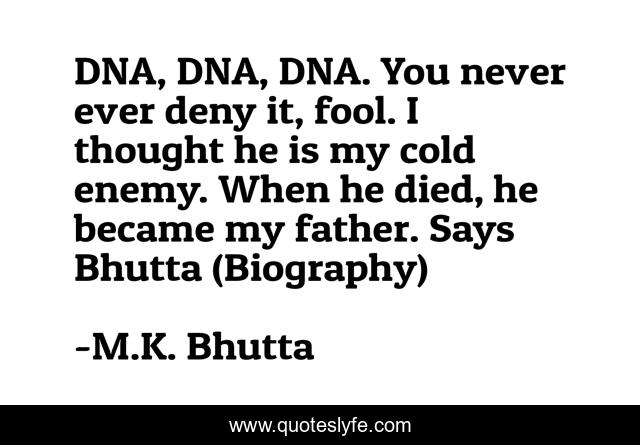This page presents the quote "DNA, DNA, DNA. You never ever deny it, fool. I thought he is my cold enemy. When he died, he became my father. Says Bhutta (Biography)". Author of this quote is M.K. Bhutta. This quote is about single-life, wisdom, marriage, truth, parents, children,.