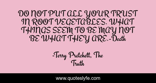 This page presents the quote "DO NOT PUT ALL YOUR TRUST IN ROOT VEGETABLES. WHAT THINGS SEEM TO BE MAY NOT BE WHAT THEY ARE.-Death". Author of this quote is Terry Pratchett, The Truth. This quote is about death, belief, potato,.