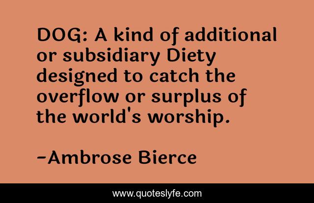 This page presents the quote "DOG: A kind of additional or subsidiary Diety designed to catch the overflow or surplus of the world's worship.". Author of this quote is Ambrose Bierce. .