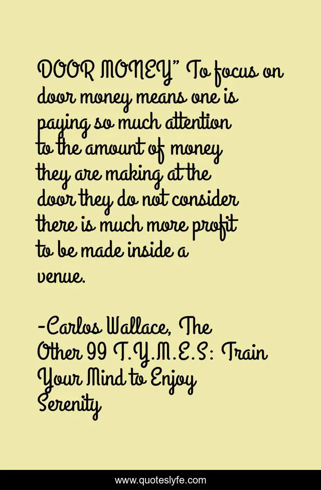 "Carlos Wallace, The Other 99 T.Y.M.E.S: Train Your Mind to Enjoy Serenity Quotes." Quoteslyfe.com, 2025. Mon. 08 Dec. 2025. <https://www.quoteslyfe.com/quote/DOOR-MONEY-To-focus-on-door-money-80168>.