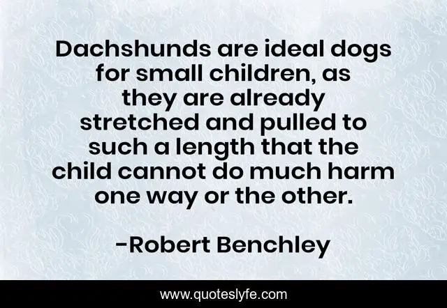 This page presents the quote "Dachshunds are ideal dogs for small children, as they are already stretched and pulled to such a length that the child cannot do much harm one way or the other.". Author of this quote is Robert Benchley. This quote is about small, children, child,.