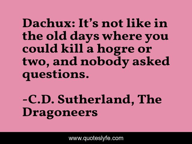 This page presents the quote "Dachux: It’s not like in the old days where you could kill a hogre or two, and nobody asked questions.". Author of this quote is C.D. Sutherland, The Dragoneers. This quote is about giants, nostalgia, species-relations,.