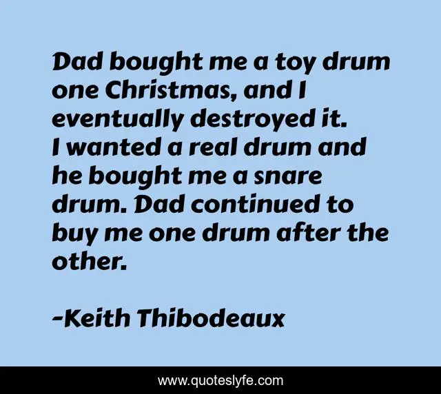 This page presents the quote "Dad bought me a toy drum one Christmas, and I eventually destroyed it. I wanted a real drum and he bought me a snare drum. Dad continued to buy me one drum after the other.". Author of this quote is Keith Thibodeaux. This quote is about me, real, toy,.
