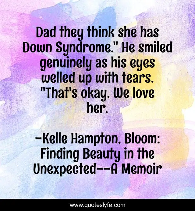 This page presents the quote "Dad they think she has Down Syndrome." He smiled genuinely as his eyes welled up with tears. "That's okay. We love her.". Author of this quote is Kelle Hampton, Bloom: Finding Beauty in the Unexpected--A Memoir. This quote is about enthusiasm, life, acceptance, down-syndrome, inspirational,.