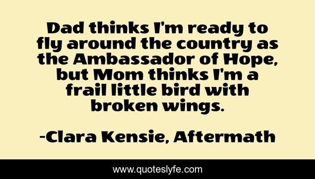 This page presents the quote "Dad thinks I'm ready to fly around the country as the Ambassador of Hope, but Mom thinks I'm a frail little bird with broken wings.". Author of this quote is Clara Kensie, Aftermath. This quote is about strength-of-spirit, kidnapping, recovery, family, sacrifice, clara-kensie, triumph-over-tragedy, strength, hopelessness,.