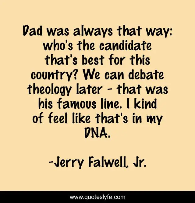 This page presents the quote "Dad was always that way: who's the candidate that's best for this country? We can debate theology later - that was his famous line. I kind of feel like that's in my DNA.". Author of this quote is Jerry Falwell, Jr.. This quote is about country, debate, best,.