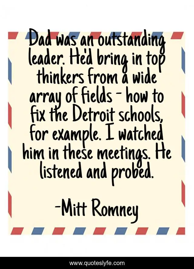 This page presents the quote "Dad was an outstanding leader. He'd bring in top thinkers from a wide array of fields - how to fix the Detroit schools, for example. I watched him in these meetings. He listened and probed.". Author of this quote is Mitt Romney. This quote is about bring, meetings, leader,.
