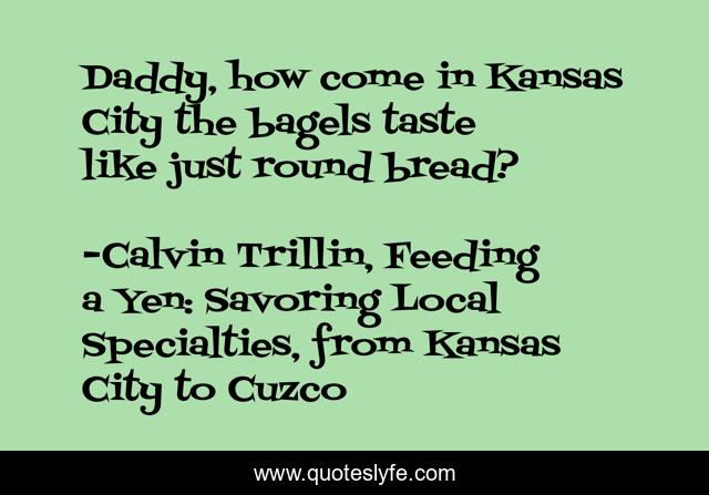 This page presents the quote "Daddy, how come in Kansas City the bagels taste like just round bread?". Author of this quote is Calvin Trillin, Feeding a Yen: Savoring Local Specialties, from Kansas City to Cuzco. This quote is about food, trillin, humor,.