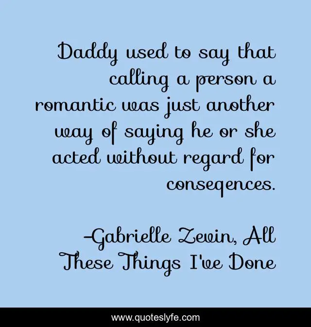 This page presents the quote "Daddy used to say that calling a person a romantic was just another way of saying he or she acted without regard for conseqences.". Author of this quote is Gabrielle Zevin, All These Things I've Done. This quote is about romantic, truth,.