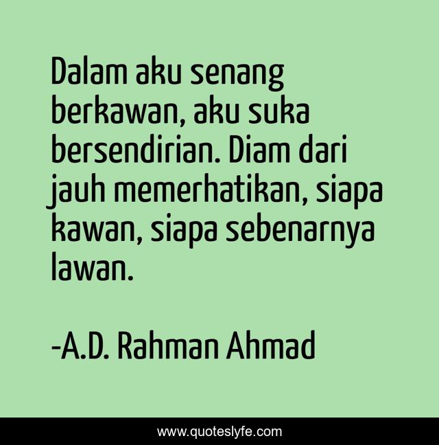 This page presents the quote "Dalam aku senang berkawan, aku suka bersendirian. Diam dari jauh memerhatikan, siapa kawan, siapa sebenarnya lawan.". Author of this quote is A.D. Rahman Ahmad. .