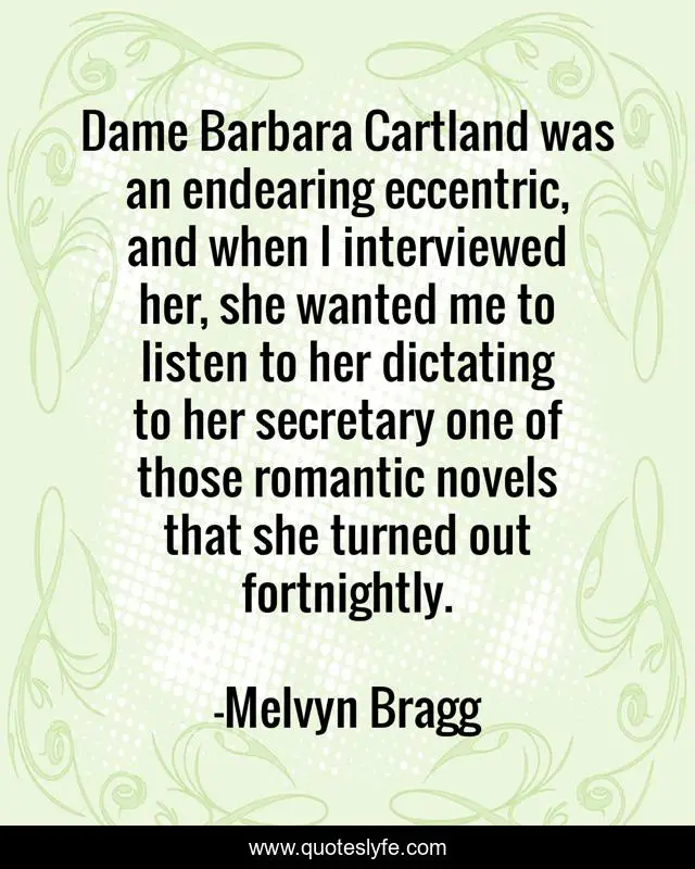This page presents the quote "Dame Barbara Cartland was an endearing eccentric, and when I interviewed her, she wanted me to listen to her dictating to her secretary one of those romantic novels that she turned out fortnightly.". Author of this quote is Melvyn Bragg. This quote is about me, she, listen,.