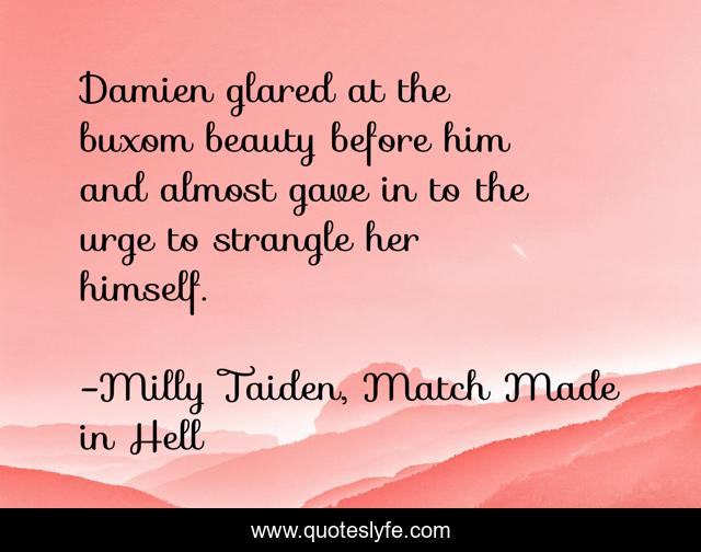 This page presents the quote "Damien glared at the buxom beauty before him and almost gave in to the urge to strangle her himself.". Author of this quote is Milly Taiden, Match Made in Hell. .