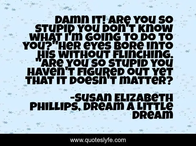 This page presents the quote "Damn it! Are you so stupid you don't know what I'm going to do to you?"Her eyes bore into his without flinching. "Are you so stupid you haven't figured out yet that it doesn't matter?". Author of this quote is Susan Elizabeth Phillips, Dream a Little Dream. This quote is about angst, drama, heart-wrenching,.