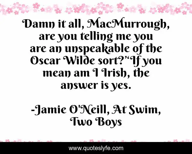 This page presents the quote "Damn it all, MacMurrough, are you telling me you are an unspeakable of the Oscar Wilde sort?’‘If you mean am I Irish, the answer is yes.". Author of this quote is Jamie O'Neill, At Swim, Two Boys. This quote is about oscar-wilde, irish,.