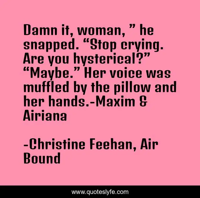 This page presents the quote "Damn it, woman, ” he snapped. “Stop crying. Are you hysterical?” “Maybe.” Her voice was muffled by the pillow and her hands.-Maxim & Airiana". Author of this quote is Christine Feehan, Air Bound. This quote is about maybe-hysterical, crying,.