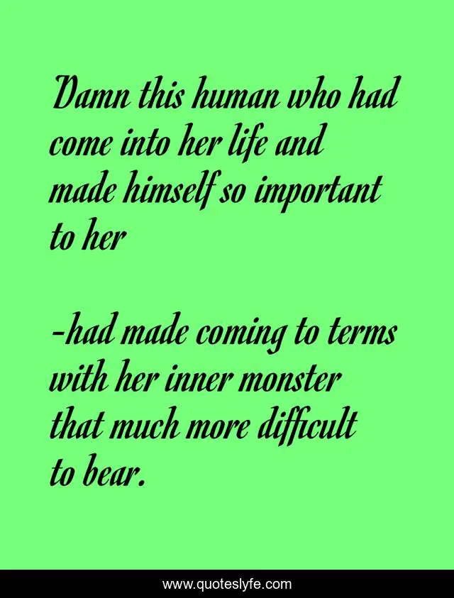 "had made coming to terms with her inner monster that much more difficult to bear. Quotes." Quoteslyfe.com, 2025. Mon. 08 Dec. 2025. <https://www.quoteslyfe.com/quote/Damn-this-human-who-had-come-into-280088>.