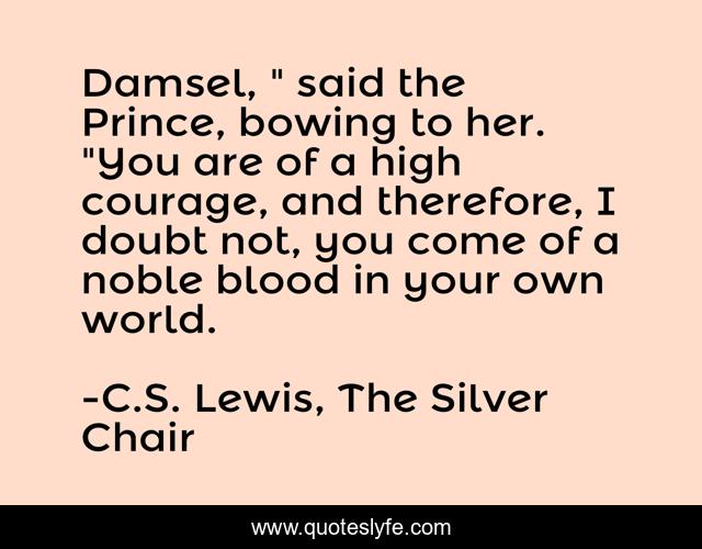 This page presents the quote "Damsel, " said the Prince, bowing to her. "You are of a high courage, and therefore, I doubt not, you come of a noble blood in your own world.". Author of this quote is C.S. Lewis, The Silver Chair. This quote is about prince-rilian, courage, damsel, jill-pole,.