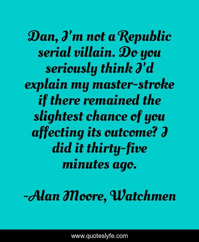 This page presents the quote "Dan, I'm not a Republic serial villain. Do you seriously think I'd explain my master-stroke if there remained the slightest chance of you affecting its outcome? I did it thirty-five minutes ago.". Author of this quote is Alan Moore, Watchmen. This quote is about plot, life, ozymandias, evil, apocalypse, mastermind,.