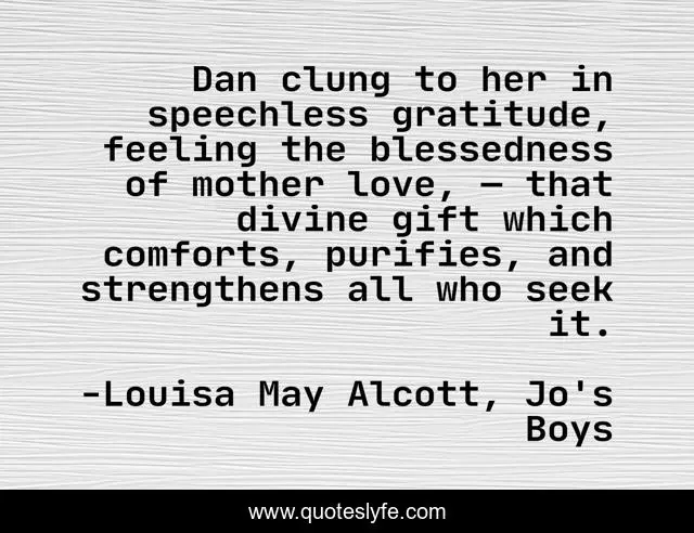 This page presents the quote "Dan clung to her in speechless gratitude, feeling the blessedness of mother love, — that divine gift which comforts, purifies, and strengthens all who seek it.". Author of this quote is Louisa May Alcott, Jo's Boys. This quote is about louisa-may-alcott, jo-s-boys, mothers,.