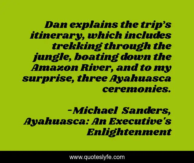 This page presents the quote "Dan explains the trip’s itinerary, which includes trekking through the jungle, boating down the Amazon River, and to my surprise, three Ayahuasca ceremonies.". Author of this quote is Michael Sanders, Ayahuasca: An Executive's Enlightenment. This quote is about psychedelics, ayahuasca, consciousness, environmentalism, entheogens, spirituality, amazon, exploration, jungle,.