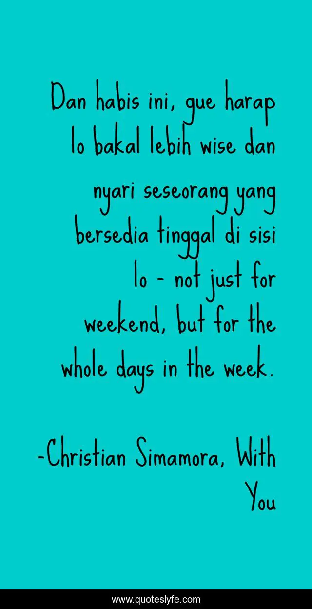 This page presents the quote "Dan habis ini, gue harap lo bakal lebih wise dan nyari seseorang yang bersedia tinggal di sisi lo - not just for weekend, but for the whole days in the week.". Author of this quote is Christian Simamora, With You. This quote is about romance, cute, romantic-comedy,.