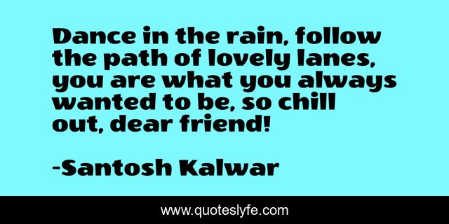 This page presents the quote "Dance in the rain, follow the path of lovely lanes, you are what you always wanted to be, so chill out, dear friend!". Author of this quote is Santosh Kalwar. This quote is about humor, inspirational, love, truth, enthusiasm, affection,.