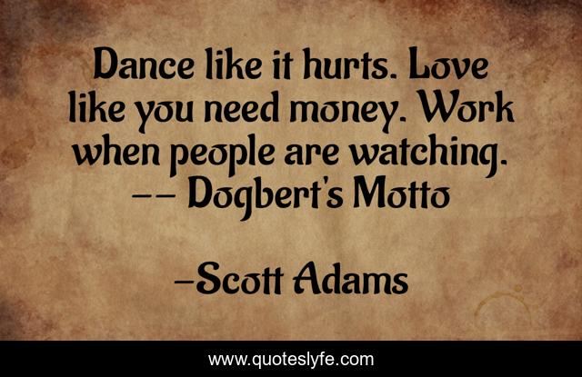 This page presents the quote "Dance like it hurts. Love like you need money. Work when people are watching. -- Dogbert's Motto". Author of this quote is Scott Adams. This quote is about philosophy, humor,.